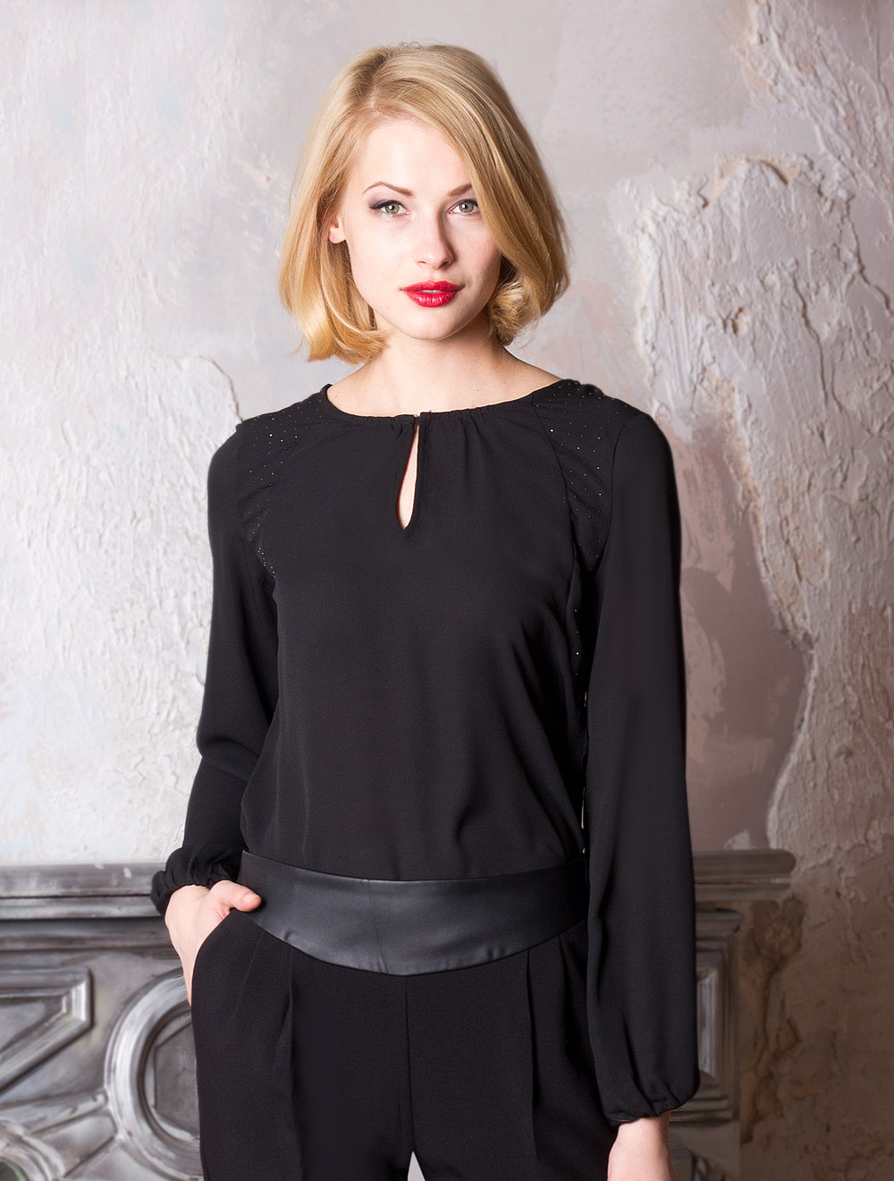 Описание: Матовый драпируемый полиэстер. Широкие рукава на сборке внизу. На плечах фигурные вставки с нанесением - мелкие фактурные точки черной блестящей краской, имитирующие стразы, но более износостойкие. Застежка спереди на одну пуговицу.