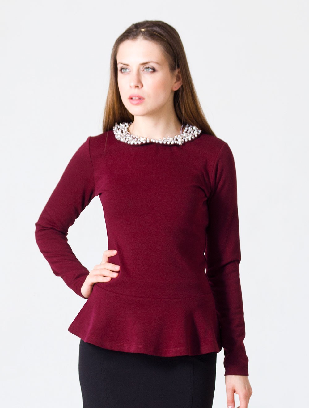 Описание: плотный трикотаж-джерси, воротник расшит бусинами, бисером и пайетками, застежка сзади на пуговицу