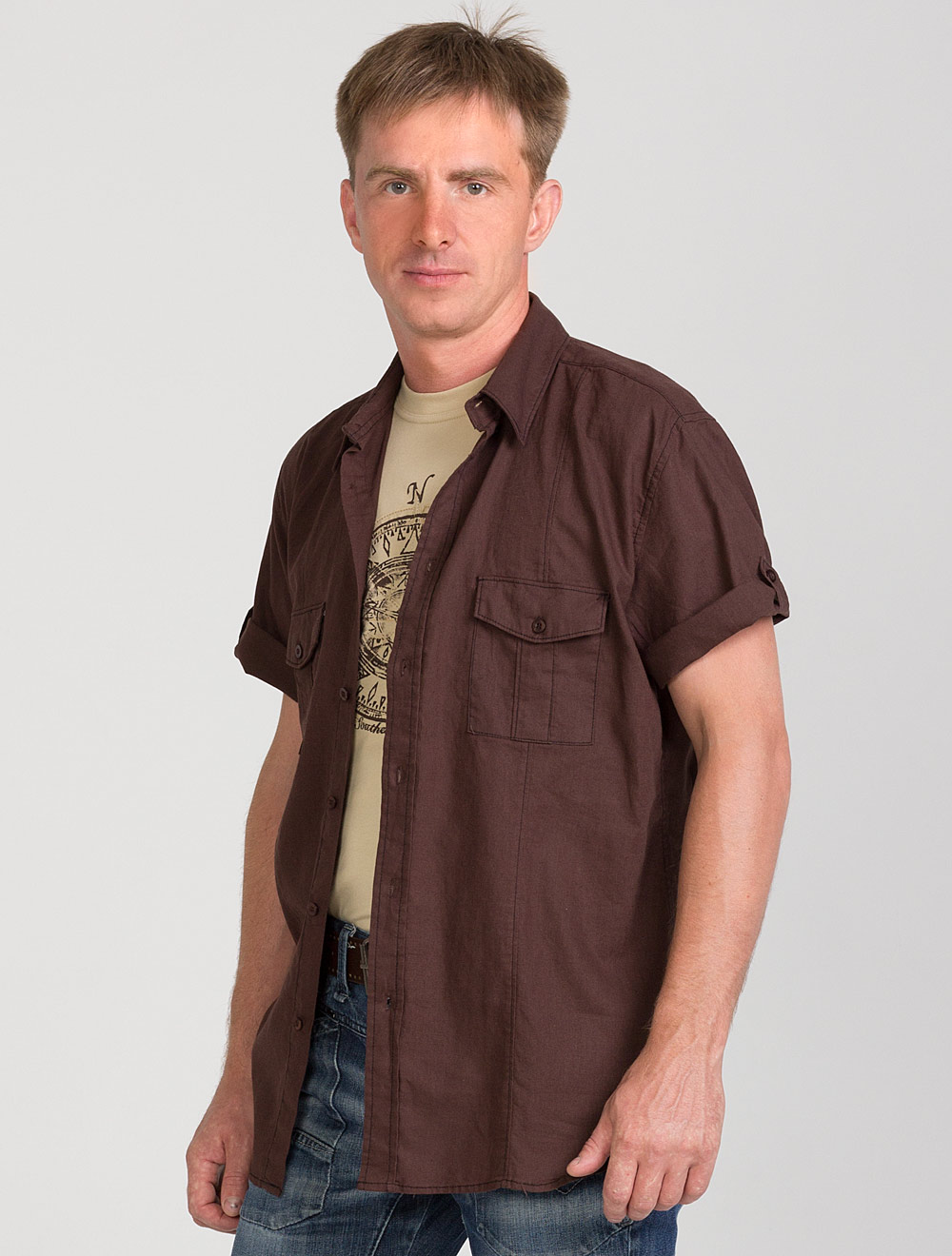 Описание: Мужская сорочка прямого силуэта выполнена из натурального полотна. Спереди на груди накладные карманы застегивающиеся на пуговицу. Рукава короткие, с возможностью отворта и закрепления на пату.