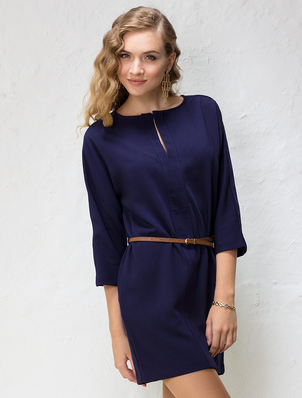 Описание: Плотная и фактурная, хорошо драппируемая ткань. Свободный силуэт, крой рукава "летучая мышь", рукав длиной 3/4. Формоустойчивость за счет широких декоративных планок по центру переда и наружному шву рукава. В стоимость входит узкий ремень св. коричневого цвета. В больших размерах платье почти по колено.