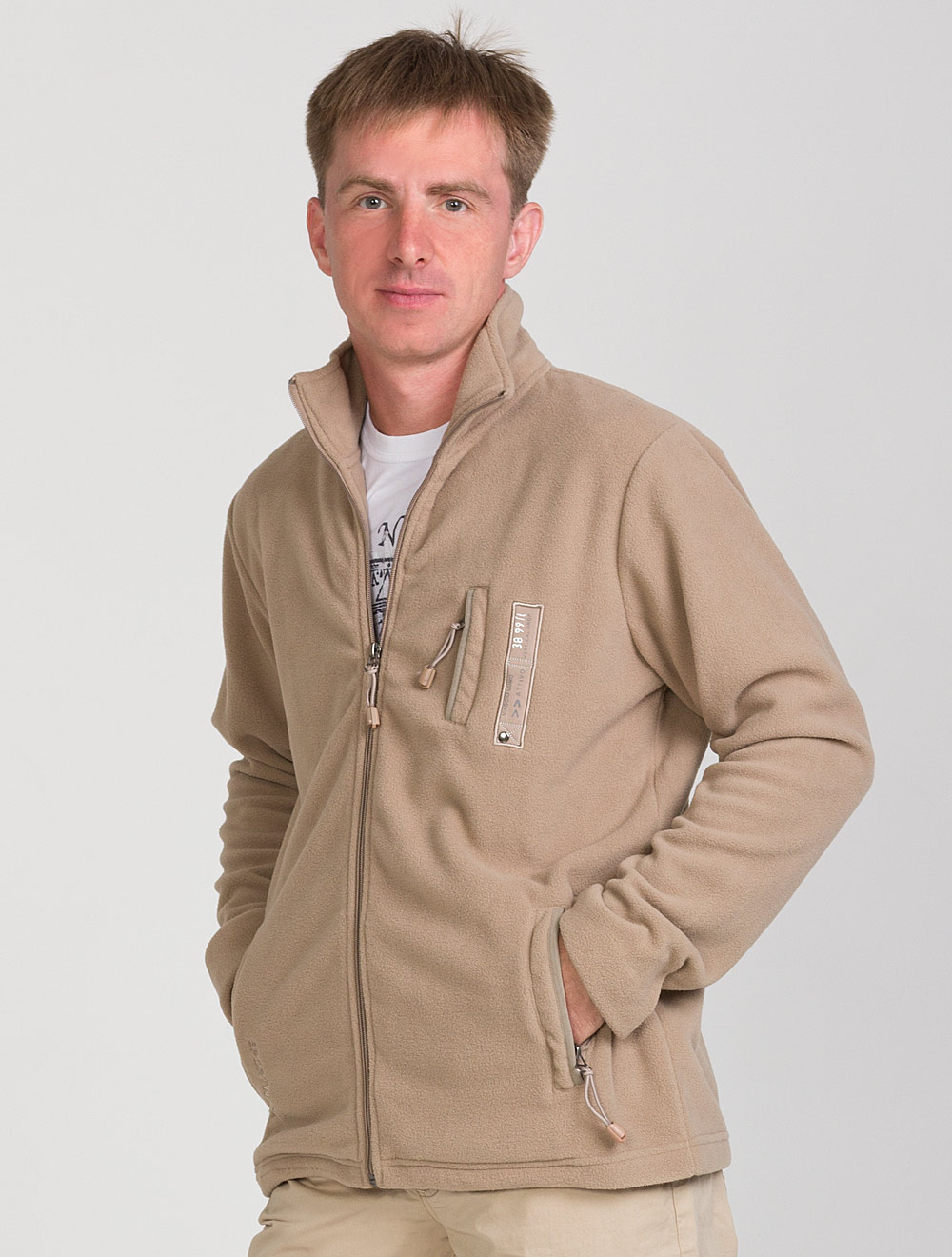 Описание: Жакет на молнии из плотного флиса. Прорезные карманы на молнии. На груди декоративный элемент с принтом и заклепокй.