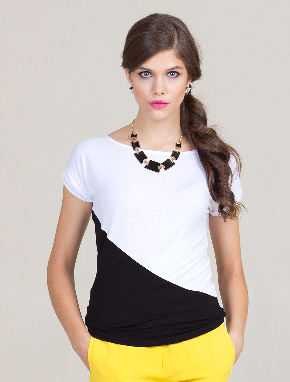 Описание: Изделие выполнено из эластичной трикотажной вискозы, с цельнокройным рукавом с манжетом. Специфика в ассиметричной линии соединения ярко-розовой и синей частей изделия проходящей чуть выше и чуть ниже талии, как спереди, так и сзади.