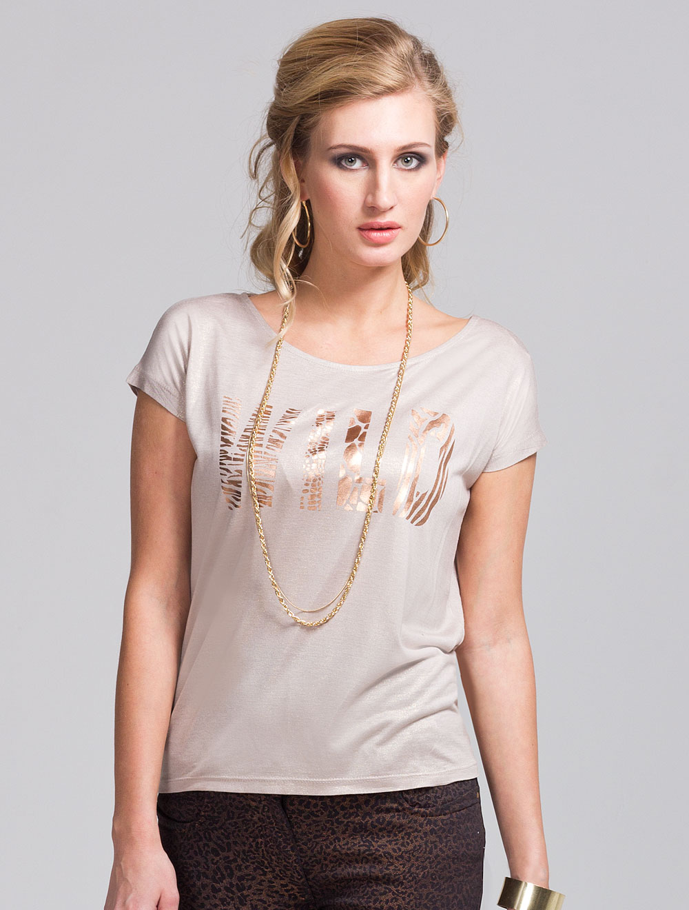 Описание: Тонкий пластичный трикотаж с элегантным золотистым напылением, принт "WILD" выполнен мягким принтом "фольга" медного цвета