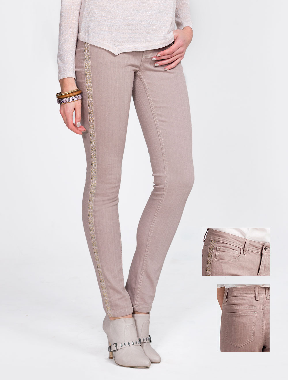 Описание: Выполнены из плотного эластичного "джинсового" хлопка, нижняя линия украшена тесьмой с этническим узором, расшитым матовыми пайетками, нижний срез аккуратно обраотан во избежание зацепок на колготках.