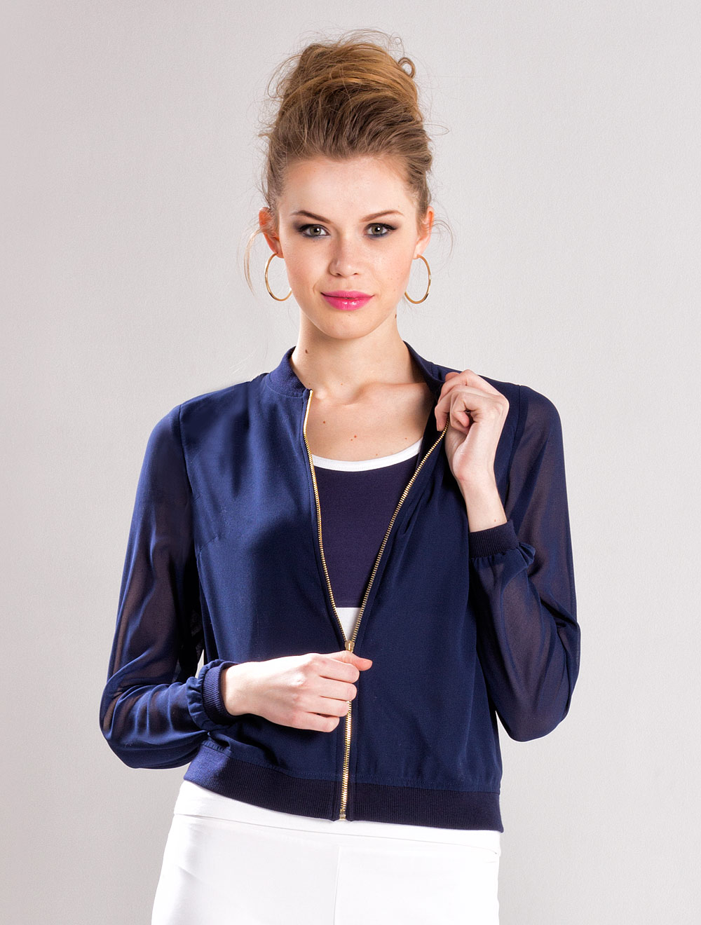 Описание: Жакет по форме "бомбер" выполнен из шифона, перед и спинка на подкладке, а рукава оставлены прозрачными; низ, манжеты и ворот из формоустойчивой рибаны. Золотистая молния с эффектной подвеской.