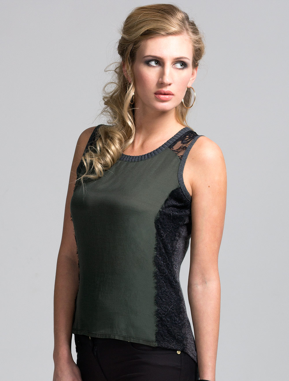 Описание: Топ удлиненный, сзади выполнен из вискозного трикотажа, спереди - из тонкого полиэстера. Боковые линии украшены кружевом с резным краем. Проймы и горловина на вязаной рибане. Эклектичное по стилю изделие - вариант для создания множества образов: от классических вечерних до гранжевых и смелых.