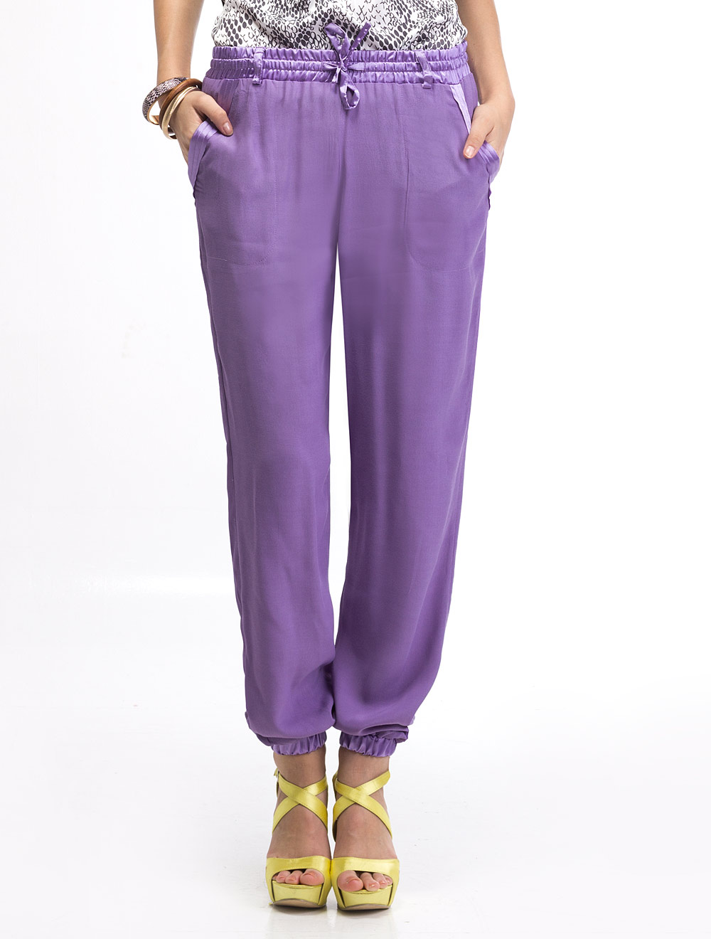 Описание: Фактурная вискоза средней плотности. Брюки на талии с кулиской на резинке и с декоративной завязкой. Пояс и карманы оформлены атласной тканью. Низ также на сборке.
