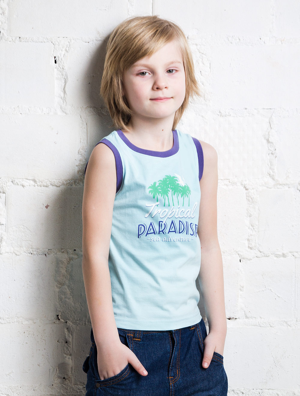 Описание: Майка с принтом на тропическую тему. Контрастная окантовка горловины и пройм