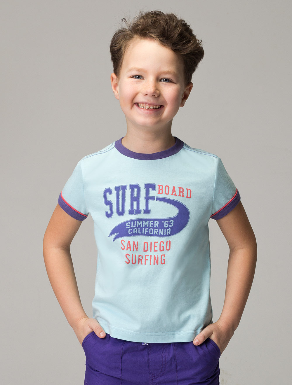 Описание: Футболка с принтом на тему серфинга. Контрастная окантовка горловины и низа рукавов с коралловым кантом.