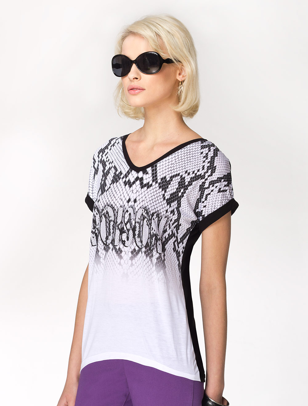 Описание: Выполнено из двух расцветок трикотажной вискозы. Спинка, манжеты и окантовка горловины черного цвета, перед белого цвета с черно-белым фото-принтом под кожу притона, внутри которого можно прочесть надпись POISON.