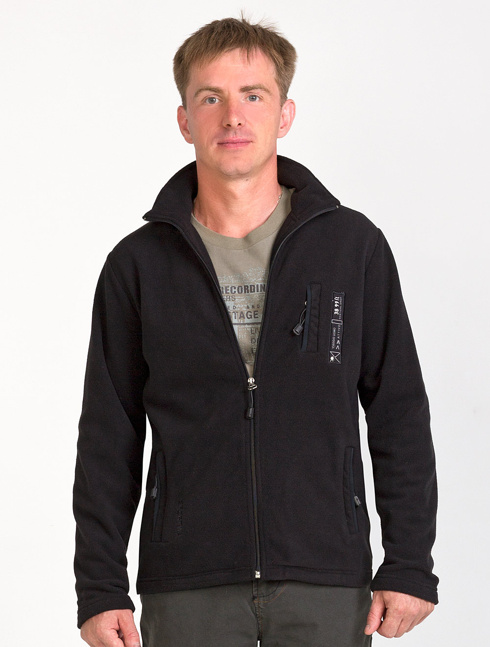 Описание: Жакет на молнии из плотного флиса. Прорезные карманы на молнии. На груди декоративный элемент с принтом и заклепокй.
