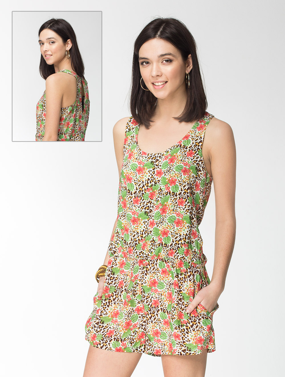 Описание: Тонкое визкозное полотно с принтом тропические цветы + шкура леопарда. Заниженая талия на резинке. Эффектный крой спинки с застежкой "капля". Верхняя часть на подкладке ярко-зеленого цвета, что эффектно смотрится в торговом зале.