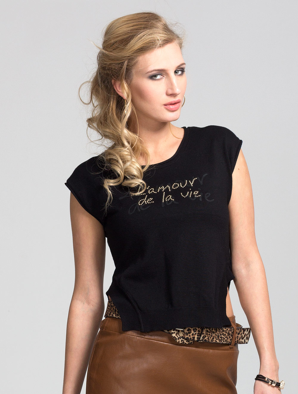 Описание: Тонкая вязка, свободный покрой. Спереди жилет украшен принтом и стразами. Жилет может носиться как самостоятельная вещь, так и в многослойных комплектах