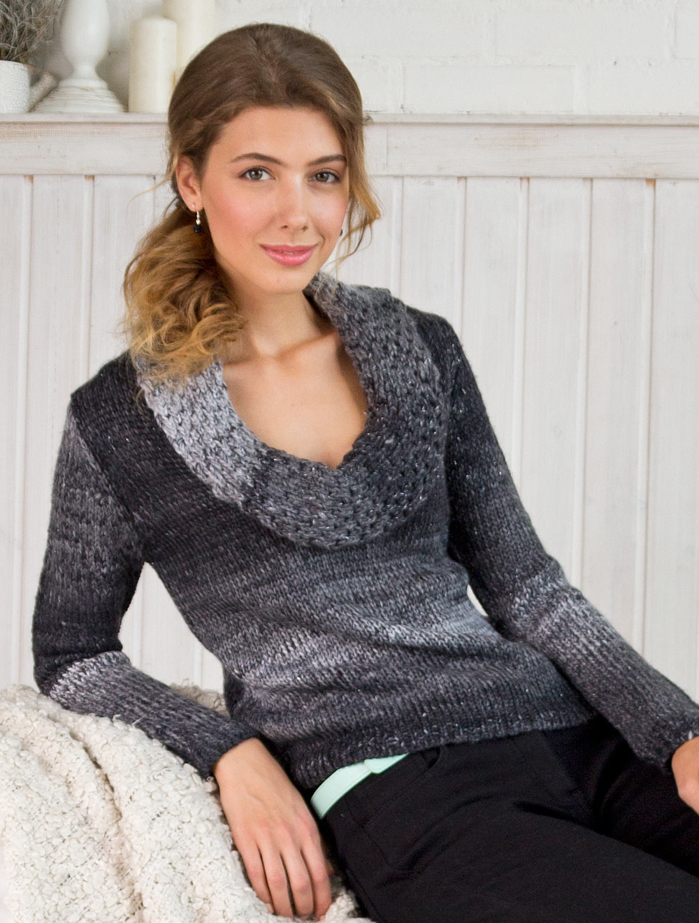 Описание: Крупная вязка, пряжа - многоцветный меланж с добавлением мягкого люрекса, глубокий вырез декольте, объемный ворот выполнен узорной вязкой.