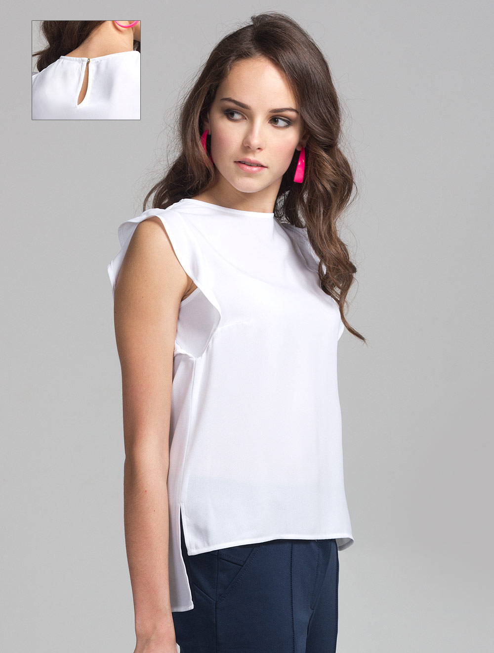 Описание: Выполнен из тонкого не прозрачного крепа, свободного силуэта и удлиненное сзади. Проймы украшены воланами. За воланом пройма имеет дополнительную вставку.