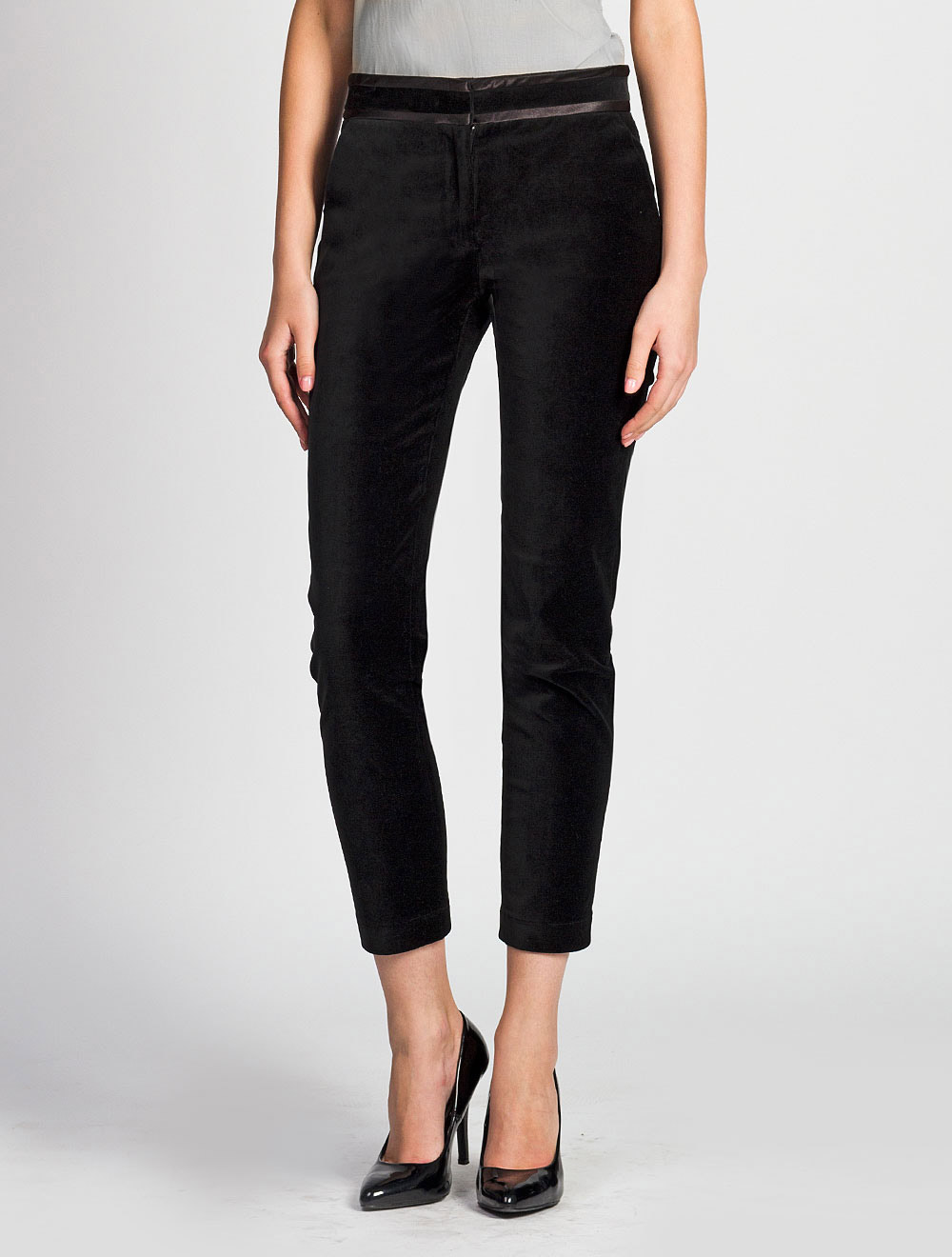 Описание: Выполнены из плотного эластичного хлопкового бархата. Пояс украшен атласными вставками. Брюки заужены книзу. Низ брючин на потайных молниях.