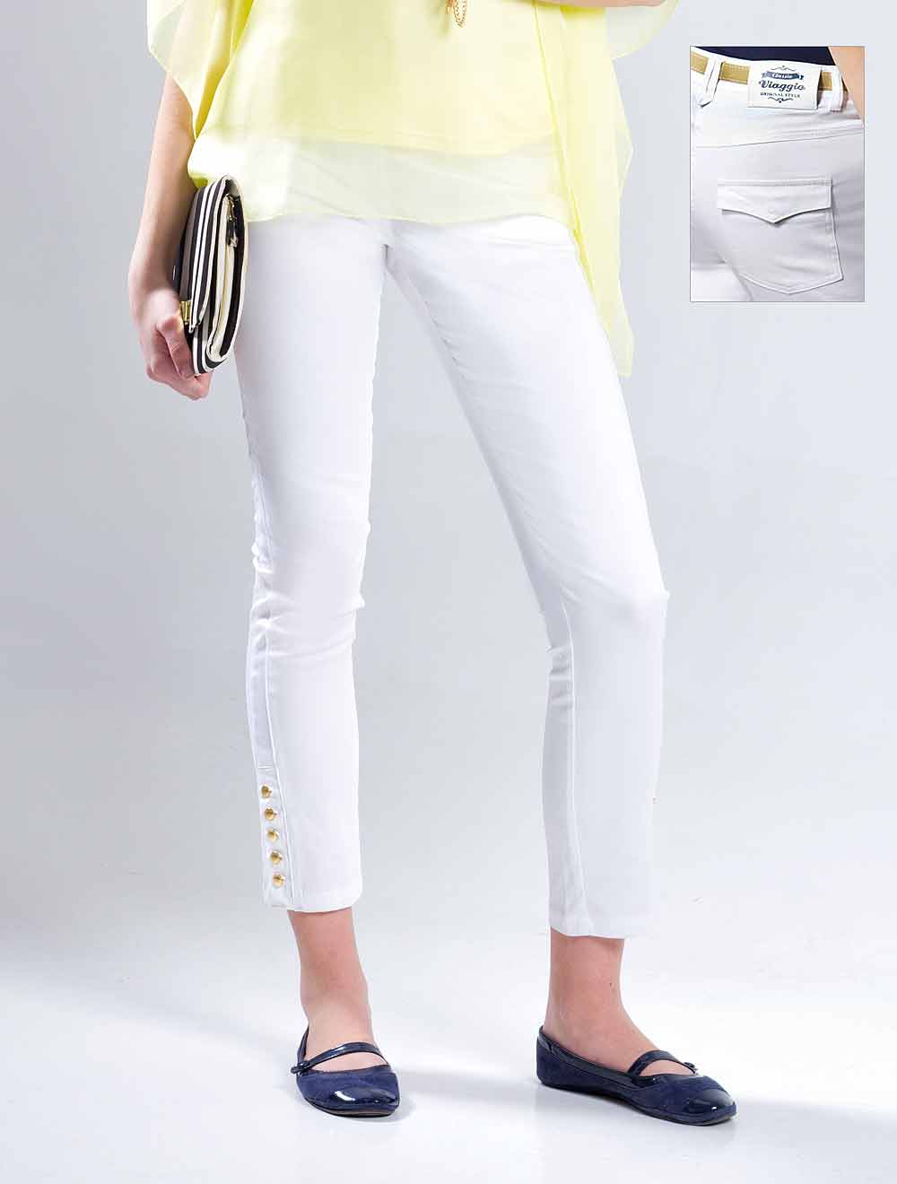 Описание: Эластичный хлопковый сатин. Укороченные брюки с декоративными линиями кроя на передней половинке. Низ брючин на шлице с рядом золотистых джинсовых болтов. Задние карманы имеют фантазийную форму клапана, пояс сзади украшен декоративной белой нашивкой с синим рисунком в стиле коллекции.