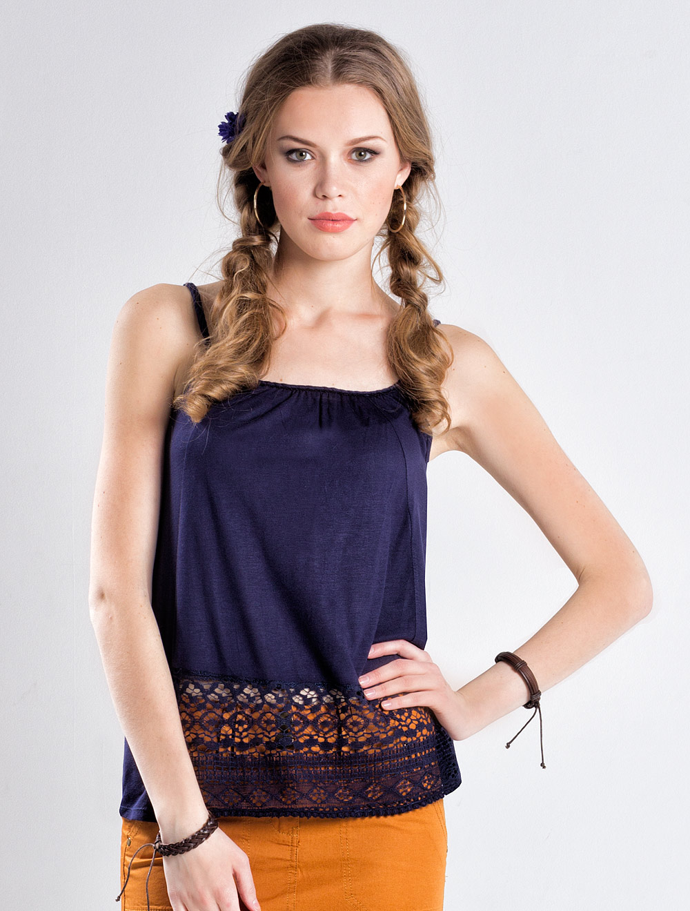 Описание: Тонкое вискозное полотно. Перед украшен вставкой из матового кружева. Горловина и бретели выполнены из плетеных косичек. Верхняя линия топа обработана с открытым срезом, на который закреплена декоративная косичка.
