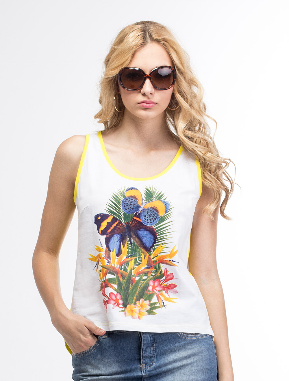 Описание: Хлопковый трикотаж средней плотности. Перед белый с ярким тропическим принтом, спинка удлиненная, желтого цвета.