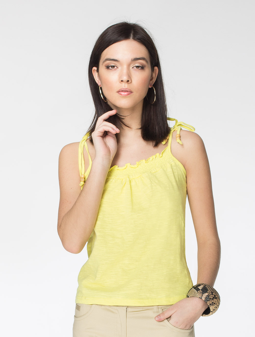 Описание: Топ из фактурного трикотажа с периодическим уплотнением волокон. Верхняя линия переда собрана на эластичные нити. Бретели в виде завязок, что удобно для регулировки посадки. Концы бретелей украшены деревянными бусинами.