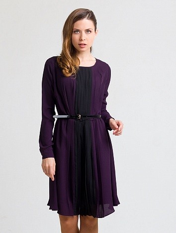 Описание: тонкий шифон, передняя часть украшена складками плиссе черного цвета, сзади застежка на молнию и золотую пуговицу, в комплекте тонкий ремень из иск.кожи фиолетового цвета
