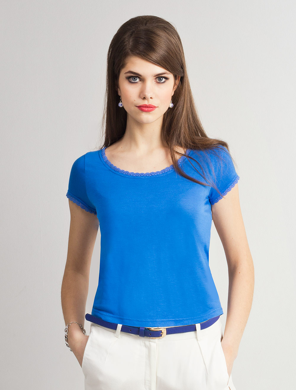 Перед и рукава из трикотажа, спинка из принтованого полотна с застежкой на пуговицы. Низ спинки украшен широким кружевом, а рукава и горловина - низким.