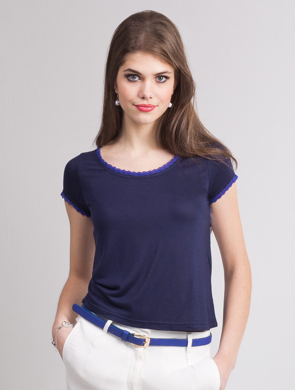 Перед и рукава из трикотажа, спинка из принтованного полотна с застежкой на пуговицы. Низ спинки украшен широким кружевом, а рукава и горловина - низким.