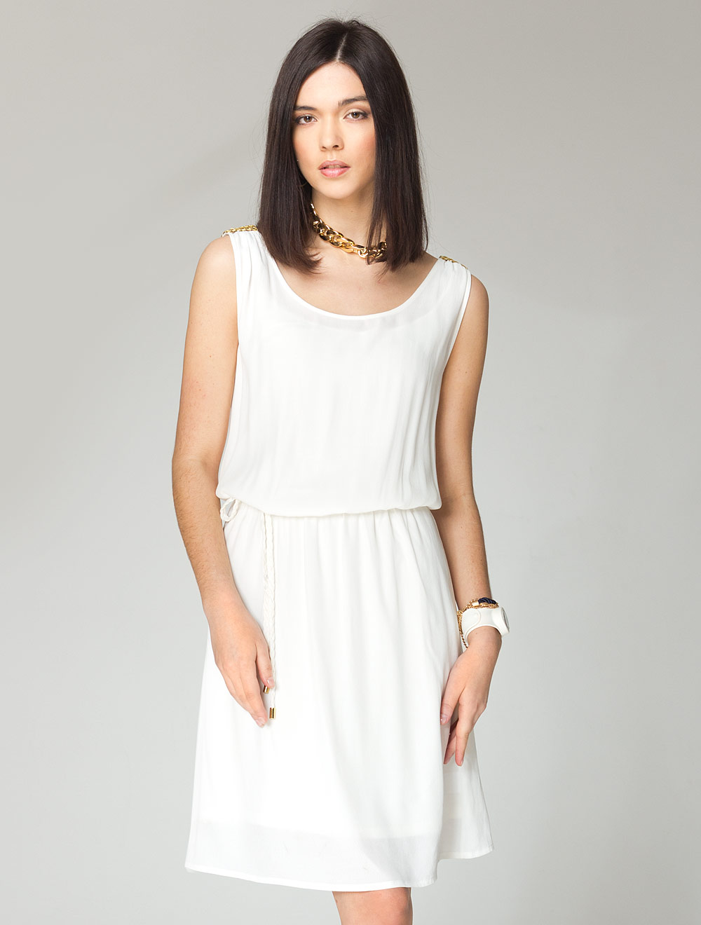 Описание: Фактурное и слегка утяжеленное вискозное полотно отлично драпируется, талия на резинке. Пояс платья выполнен из основной ткани в виде морского каната с наконечниками. Плечи украшены плетеной тесьмой из золотистых ремешков иск. кожи. Платье на подкладке.