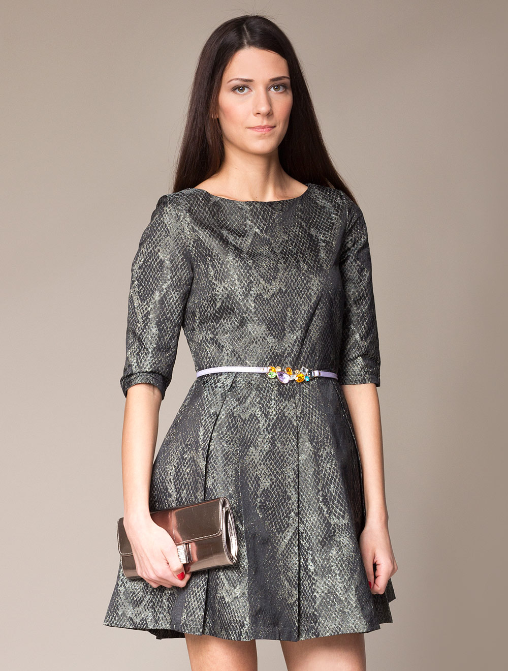 Описание: Платье из плотной тафты с золотым металлическим узором из люрекса в стиле питона. Юбка с глубокими встречными складками, расширенная к низу. На спинке металлическая золотая молния. Платье на подкладке из атласа.