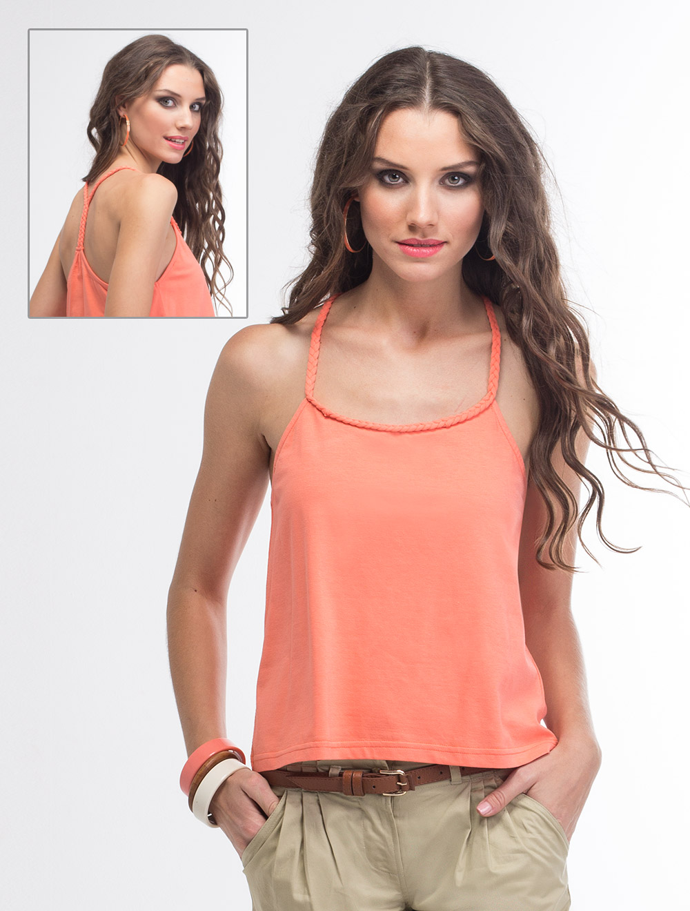Описание: Топ свободного, трапецевидного силуэта, бретели в виде плетеного шнура из основной ткани, сзади бретели соединяются в одну по центру спины.