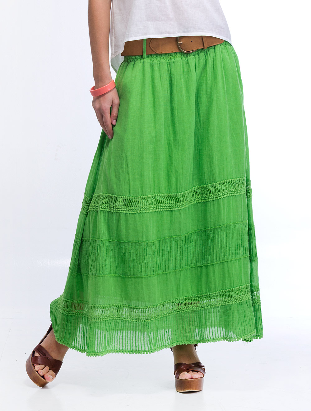 Описание: Тончайшее хлопковое полотно в основе и еще более тонкая подкладка. Юбка украшена кружевом из хлопка. Пояс выполнен из ряда эластичных нитей. В стоимость входит ремень из иск.замши.