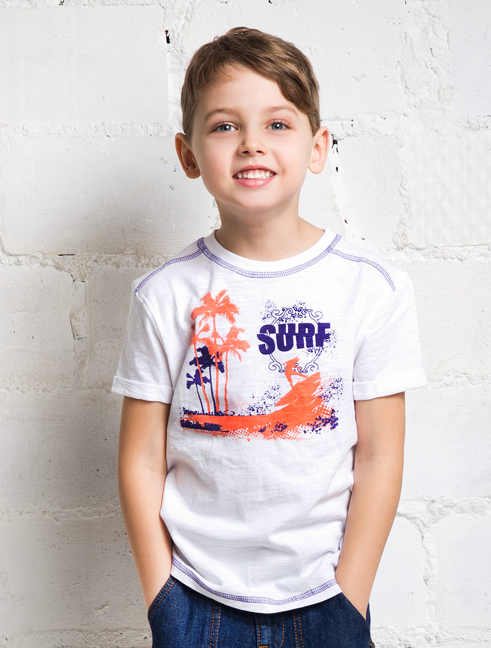 Описание: Футболка из фактурного хлопкового трикотажа с уплотнением нити в переплетении., декорированная принтом и контрастной строчкой.
