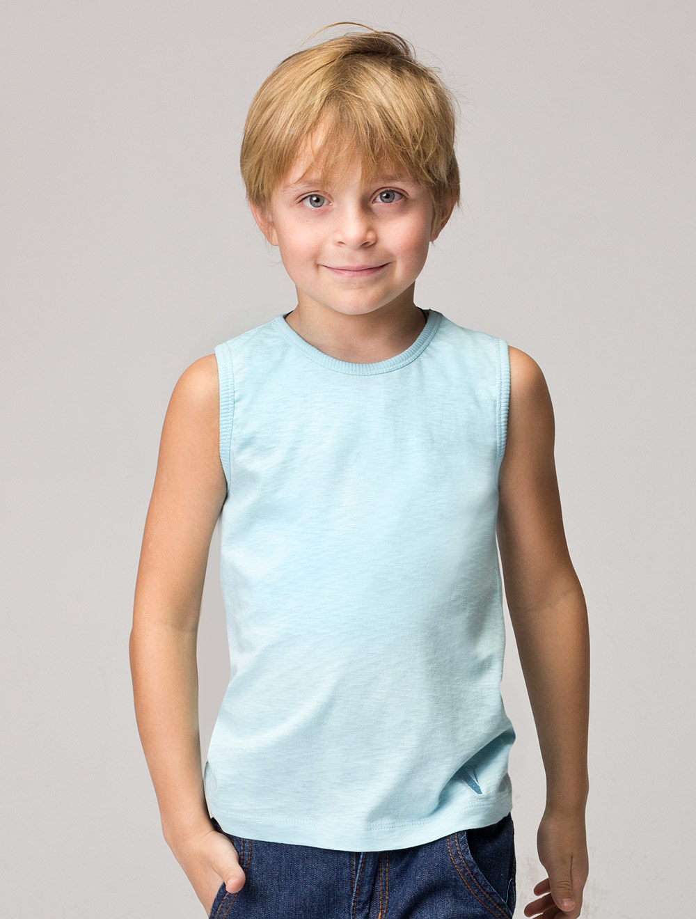 Описание: Майка из фактурного хлопкового трикотажа с уплотнением нити в переплетении. В нижнем углу изделия небольшая вышивка буква V в тон изделия.