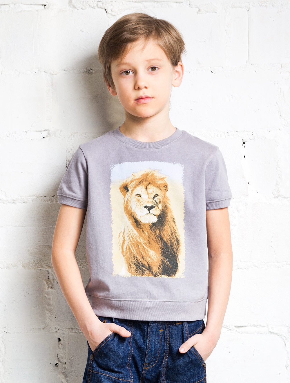 Описание: Футболка из хлопкового трикотажа, декорированная фото-принтом "лев". Низ изделия на кокетке.