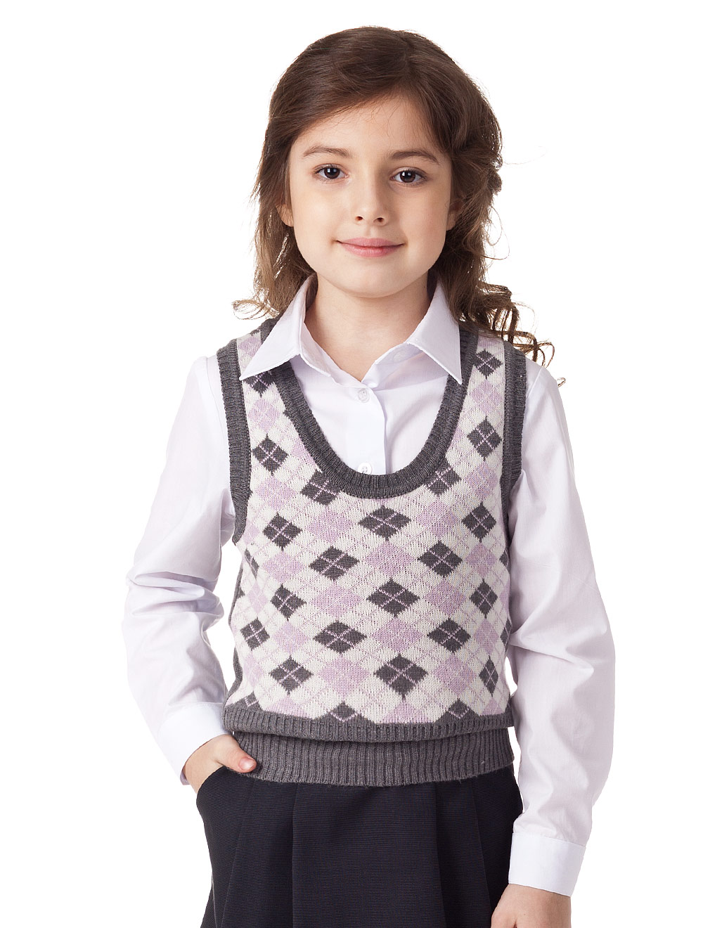 Описание: Изделие выполнено плотной вязкой. Спереди вывязан рисунок в виде ромбов,спинка однотонная.