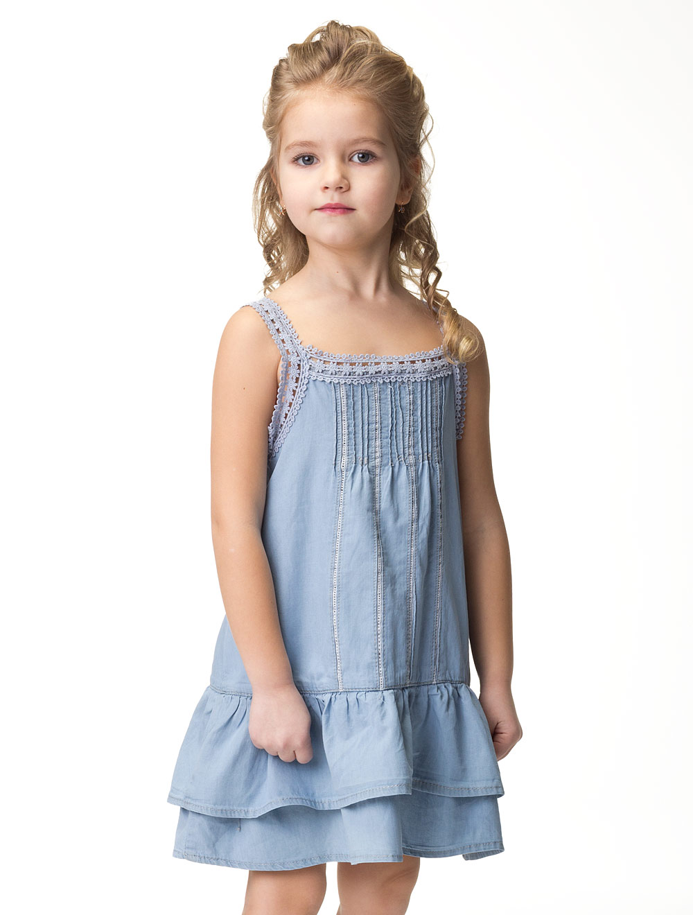 Описание: Сарафан из тонкой джинсовой ткани, декорированный хлопковым кружевом. Спинка изделия удлиненная.