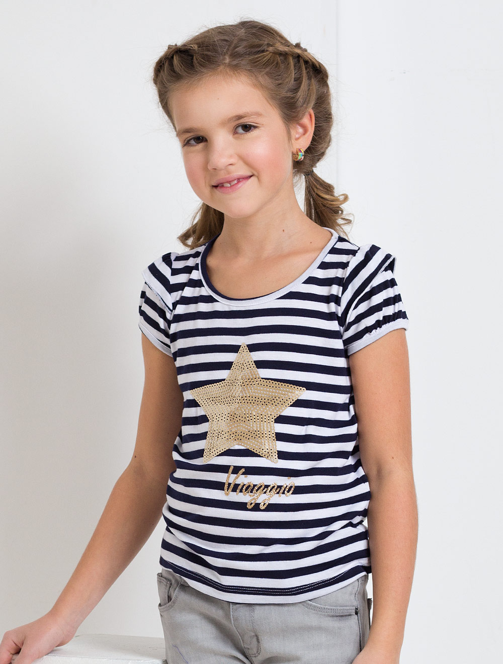 Описание: Футболка, декорированная вышивкой из пайеток. Рукава-фонарики украшены воланами в верхней части.