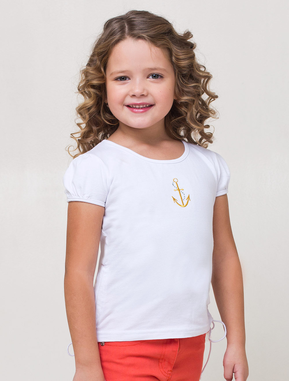Описание: Футболка из хлопкового эластичного трикотажа. Боковые швы по низу собираются завязками. На груди вышивка в виде якоря со стразами.