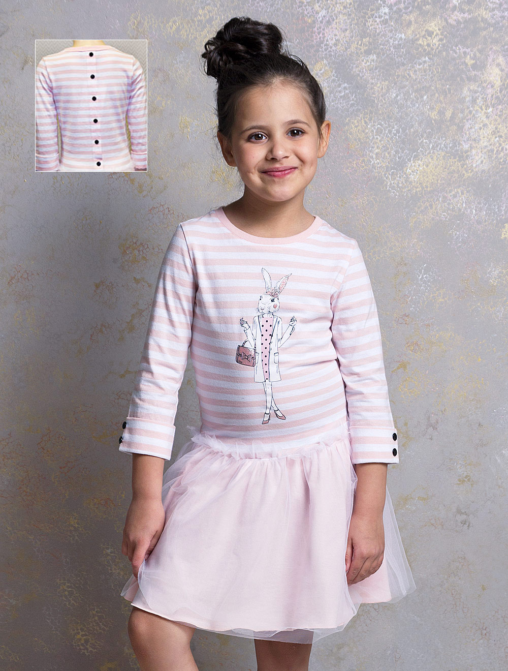 Описание: Верхняя часть платья выполнена из тонкого трикотажного полотна. По центру спинки - застежка-обманка с пуговицами. Верхняя юбка выполнена из мягкой сетки, нижняя из хлопкового трикотажного полотна. Рукава длиной три четверти с манжетами-отворотами.