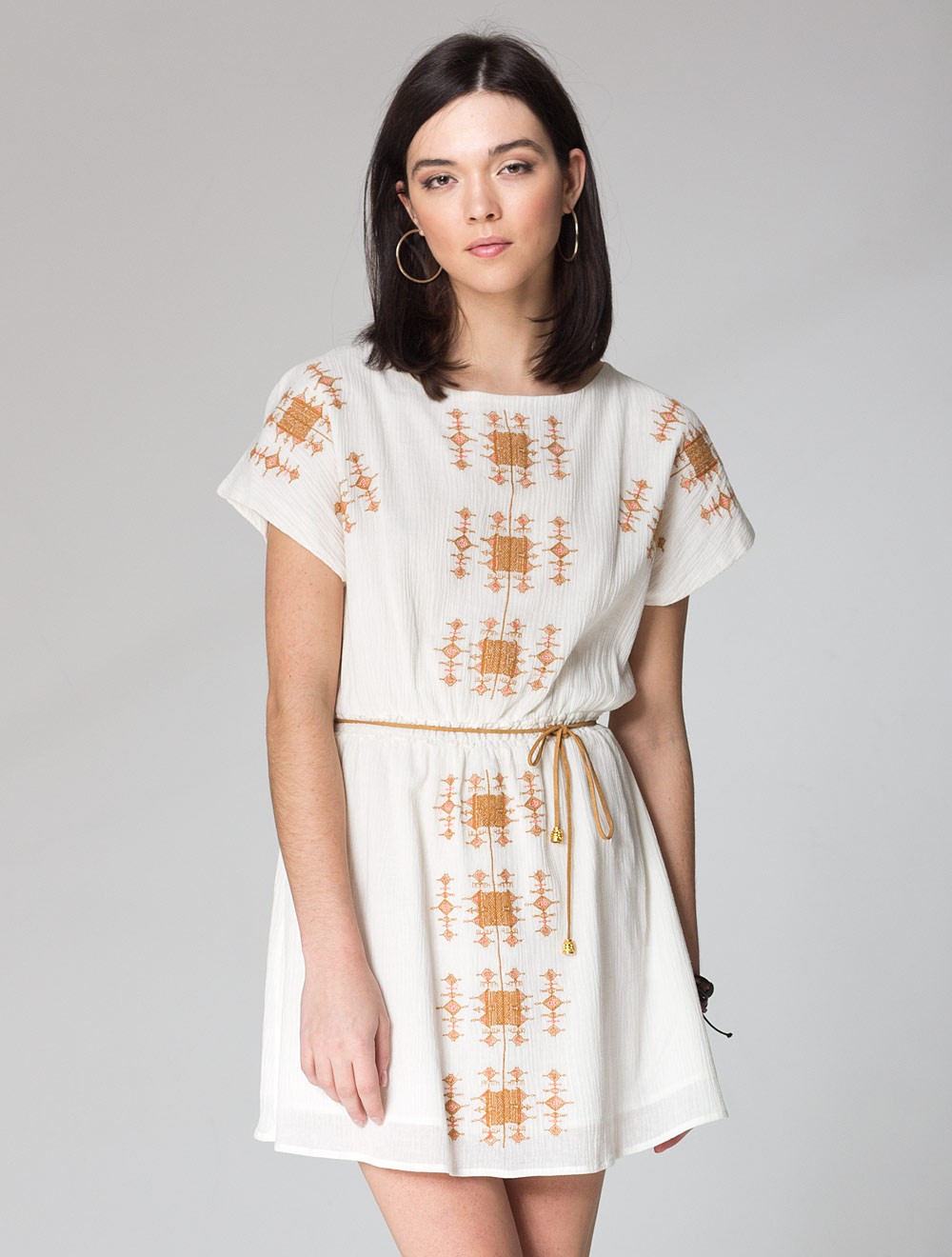 Описание: Тонкий хлопок с эффектом жатки. На хлопковой подкладке. Перед украшен вышивкой в этническом стиле. Талия на резинке и пояс выполнен из шнура иск. Замша с золотистыми резными наконечниками. В больших размерах платье по колено.