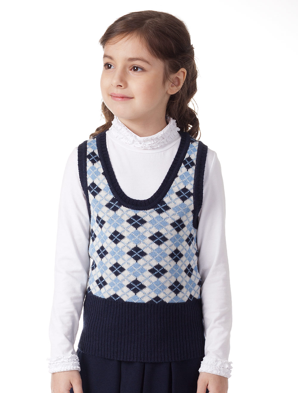 Описание: Изделие выполнено плотной вязкой. Спереди вывязан рисунок в виде ромбов,спинка однотонная.