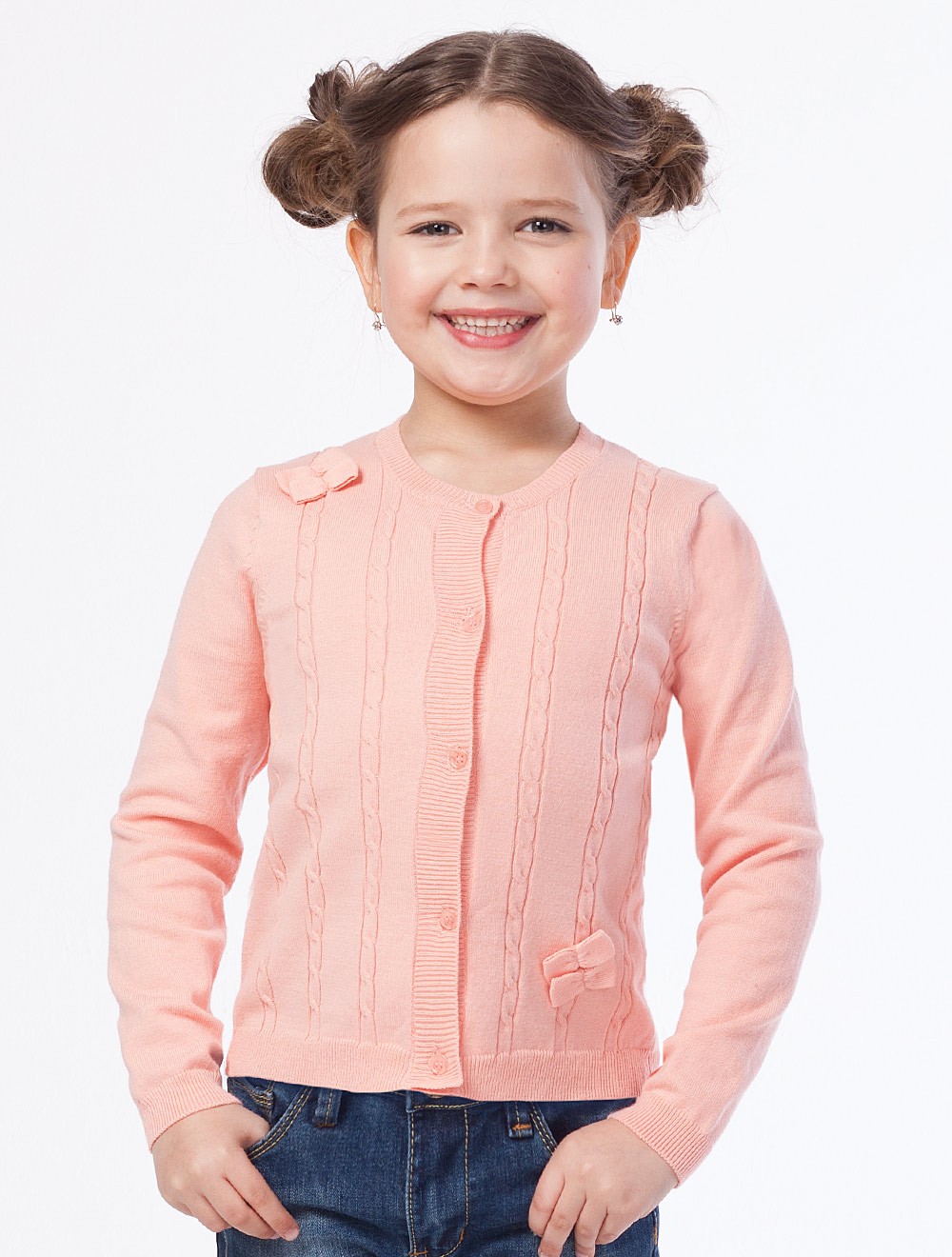 Описание: Жакет тонкой вязки. Передняя часть вывязана рисунком "косы" и декорирована бантиками. Горловина, планка, низ изделия и рукавов выполнены вязкой "резинкой".
