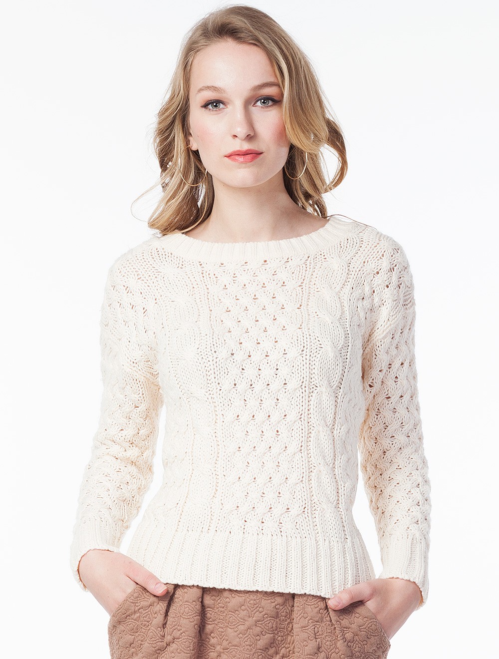 Описание: Свободный силуэт со спущенным плечом, крупная узорная вязка из толстой нити.