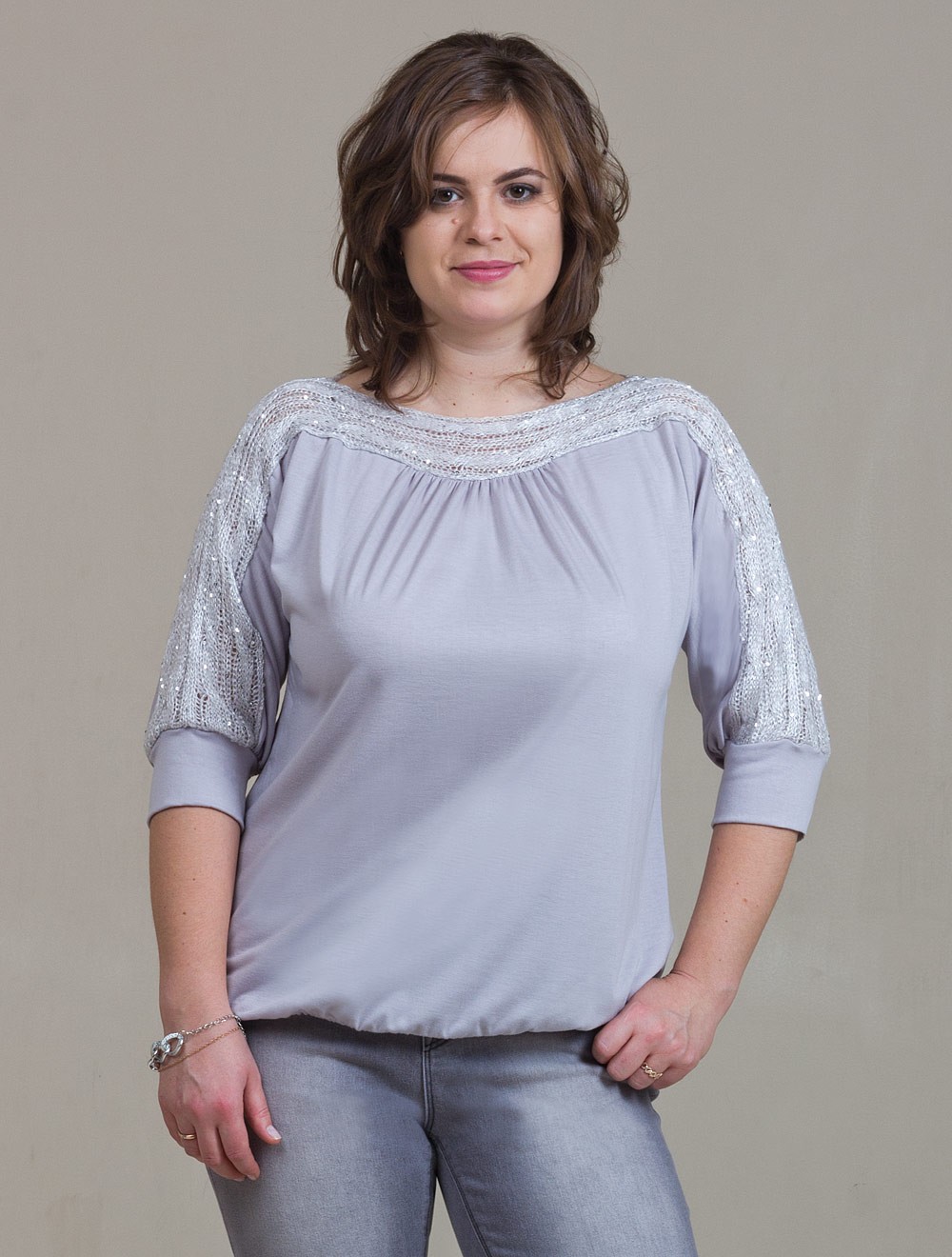 Описание: Трикотажное хорошо драпируемое полотно. Линия горловины и плеч выполнена из пряжи с мохером и вплетенными в нее мелкими серебристыми пайетками. Рукав цельнокроеный "летучая мышь" на широком манжете. Низ изделия на резинке.