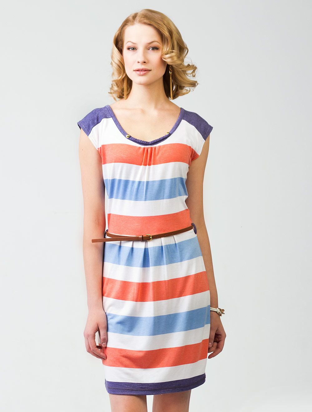 Описание: Трикотажное полотно средней плотности, полосы по кругу, платье без подкладки. Платье, отрезное по талии с узким ремешком, который входит в стоимость изделия. Т. синие. полосы с эффектом меланж. Горловина спереди украшена косичкой из основной ткани и двумя металлическими пуговицами.