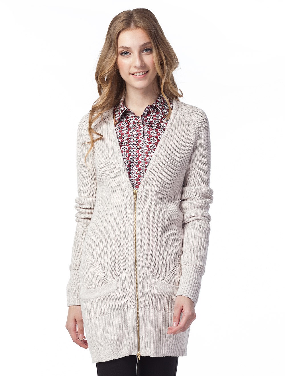 Описание: Крупная вязка резинкой 1*1. Кардиган свободного силуэта, широкие сверху и узкие внизу рукава-реглан. Застежка на двустороннюю металлическую молнию золотистого цвета