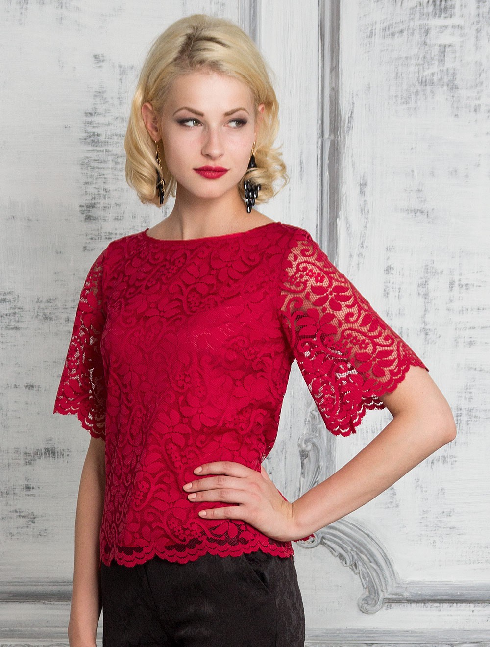 Описание: Блуза женская выполнена из кружева, перед и спинка на подкладке, рукава без подкладки имеют расширение к низу, красиво драпируются