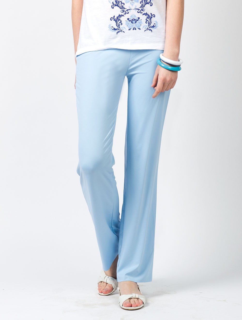 Описание: Брюки из плотного и гладкого синетического трикотажного полотна, качество которого часто используется для спортивной фитнес формы. Пояс широкий двойной - можно носить двумя способами - высоко сидящими или, загнув поплам пояс, - низко сидящими.