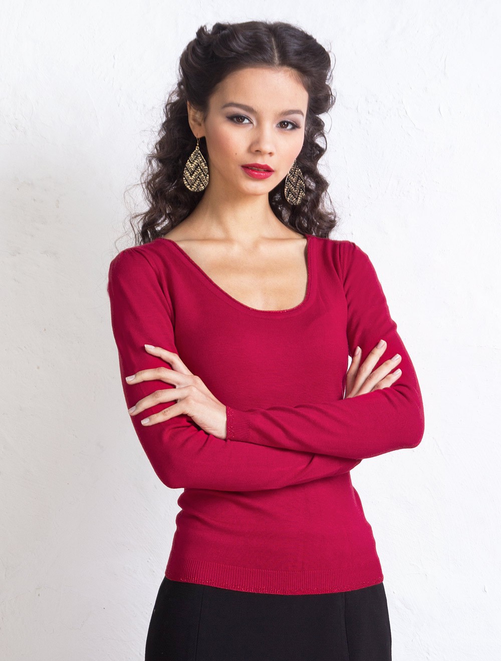 Описание: Тонкая эластичная вязка. Узкий рукав со сборкой сверху по окату, на спинке вырез с имитацией шнуровки. Линия горловины, низа и декорации сзади - украшены полосками с вплетенным мягким люрексом красного цвета.