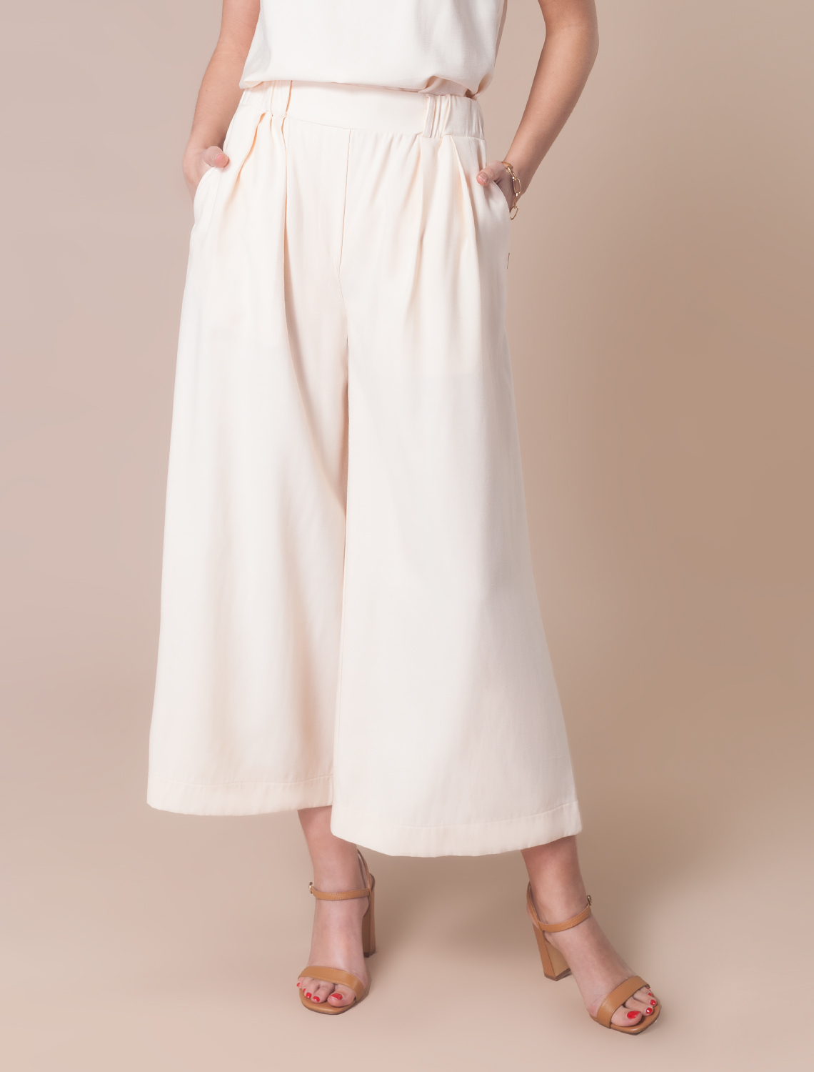 Кюлоты из плотной фактурной вискозы. Модель дополнена защипами на талии и боковыми карманами. Сзади на резинке. Свободный крой подходит для любой фигуры. Высокая посадка и защипы акцентируют талию. Совет стилиста: кюлоты идеально сочетаются в костюме с топом D23.095 на выпуск. Чтобы еще больше выделить талию, используйте ремень или любой топ в заправку. Дополните образ свободной рубашкой из вискозы, хлопка или денима.